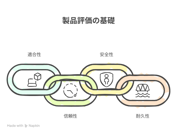 これらの要素は、単独ではなく相互に関連しています。例えば、安全性を確保するためには信頼性が不可欠であり、耐久性が低ければ顧客満足度も下がります。