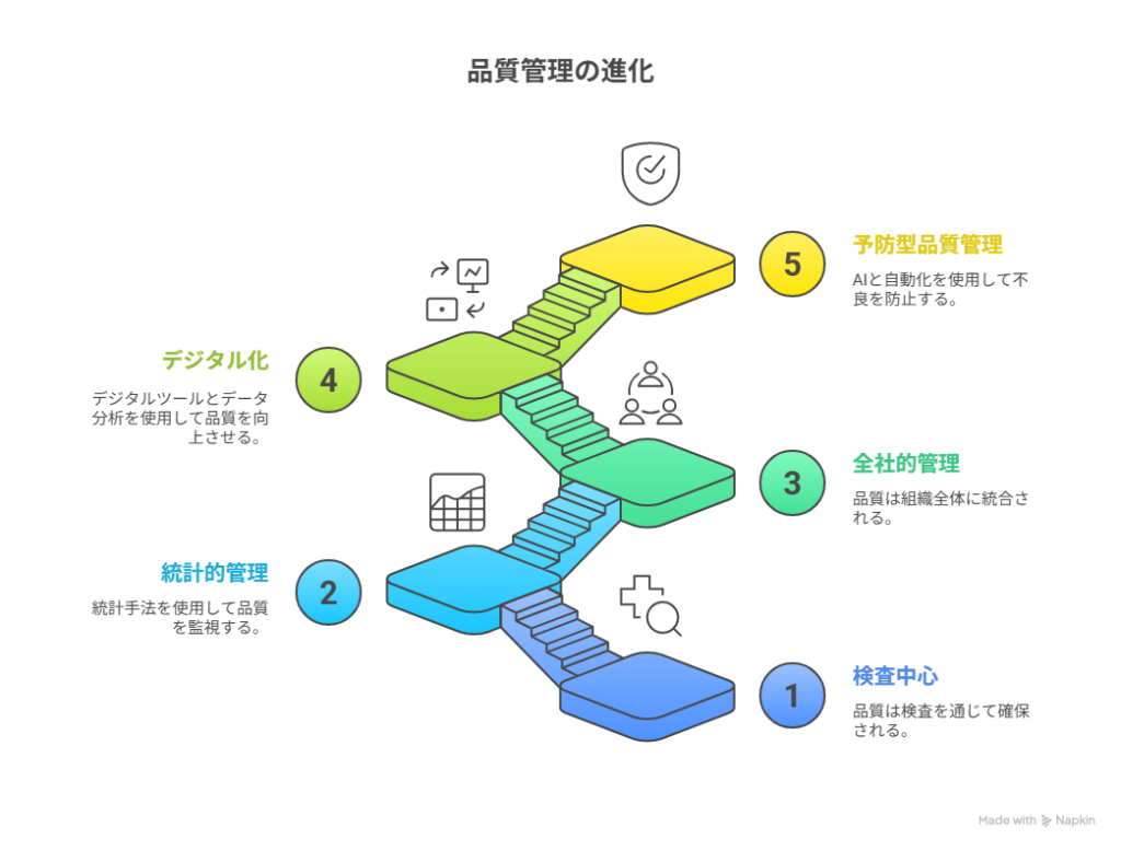 品質管理は、検査中心の時代から統計的管理、全社的管理、そしてデジタル化へと進化してきました。今後は、AIや自動化技術を活用し、不良ゼロを目指す予防型品質管理が主流となるでしょう。品質管理の歴史を理解することは、未来の品質戦略を描く上で不可欠です。